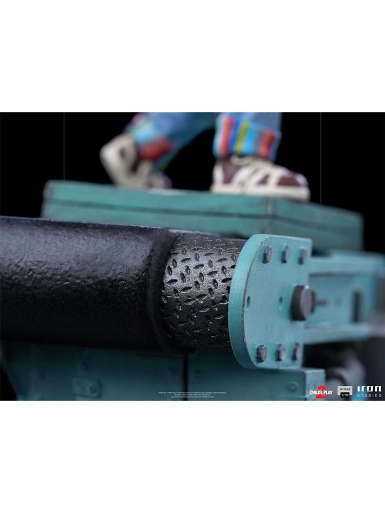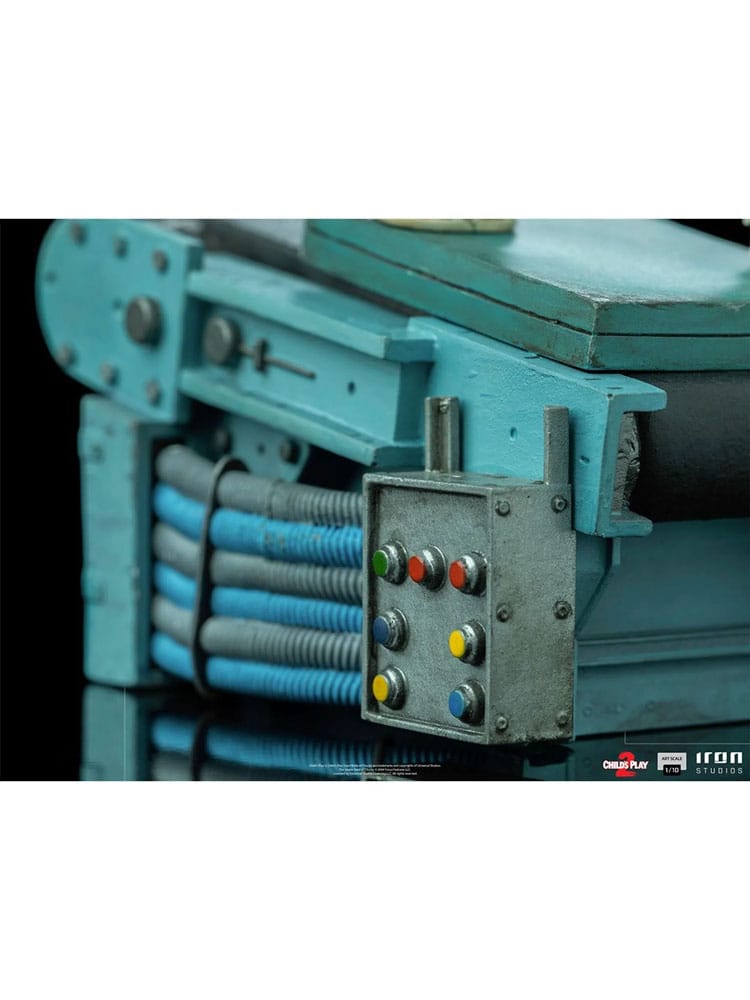 The unmistakable red-haired doll with colorful clothes is standing on the treadmill of one of the machines at the toy factory called Play Pals, where his plastic body was manufactured just like in the second film of his long trajectory in theaters. The doll appears with its lethal knife inserted in one of his fists, a sadistic smile on its face, and its big blue eyes focused on its next victim. The “Child’s Play II Chucky – Art Scale 1/10 – Child’s Play II – Iron Studios” statue arrives to add another cinema icon to Iron Studios’ horror line. The item is already available for Pre-Order.