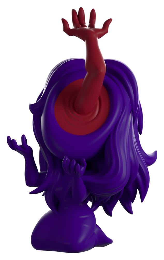 Youtooz has followed the trail of symbols into the attic to confront Amy Martin for her debut! Kneeling at 4.6 inches tall and throwing her hands forward in anguish as a demonic arm reaches towards the sky from the gaping hole where her face should be, long purple hair cascades from her head over her shoulders and arms as she wears a tight ankle-length dress. The exterior of her packaging sees a lone stone well in a dense forest, while the interior looks into an empty room with muted brown furniture. The protective sleeve is then covered in a pixelated pink and purple skyline of clouds and a setting sun, as her figure can be seen through the large, clear window at the packaging’s front. This collectible ships in a matte, embossed, protective outer sleeve and a custom-sized plastic protector for maximum protection during shipping.