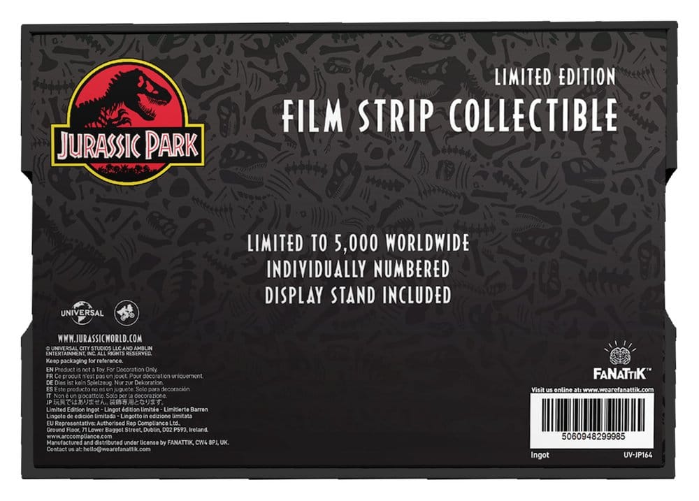 Featuring three of the most iconic scenes from the one of the most iconic films of all time, this limited edition metal film strip replica depicts the brachiosaurus standing on its hind legs to reach the high leaves, Dr Grant waving the flair to distract the T-Rex from the children trapped in the upturned Jeep, and Tim hiding from the hunting raptors in the kitchen. Individually numbered to the reverse as one of 5,000 worldwide, the ingot comes with a display stand is finished with a dyed black plating.