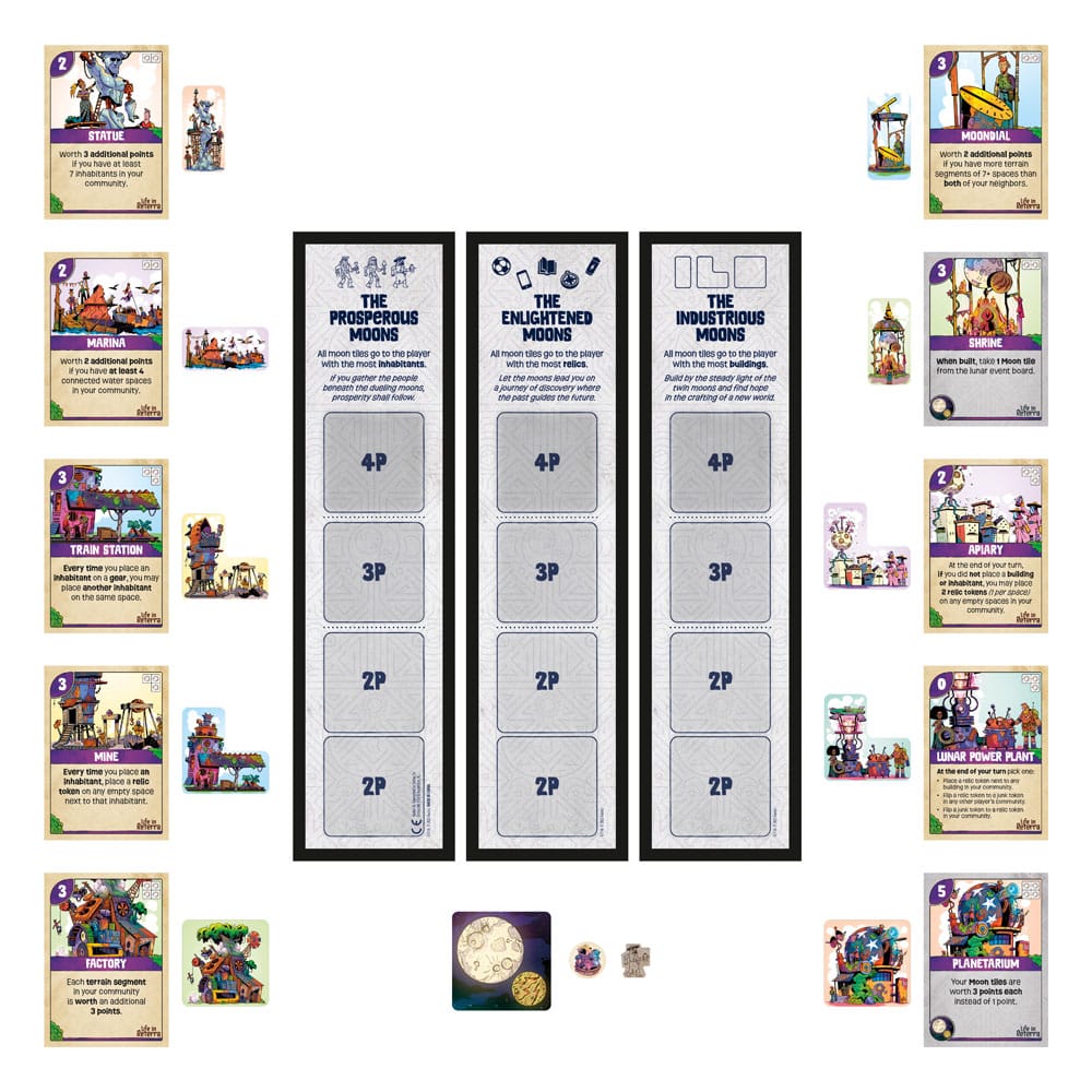 Includes 30 Moon Tiles, 10 Double-Sided Building Cards, 54 Building Tiles, 2 Storage Trays, 3 Lunar Event Boards, 16 Inhabitant Pawns, 10 Junk/Relic Tokens, and Expansion Guide.