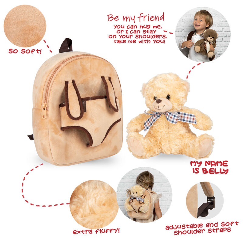 Hátizsák és ráköthető puga plüss figura. Mérete: 26x21x8cm.