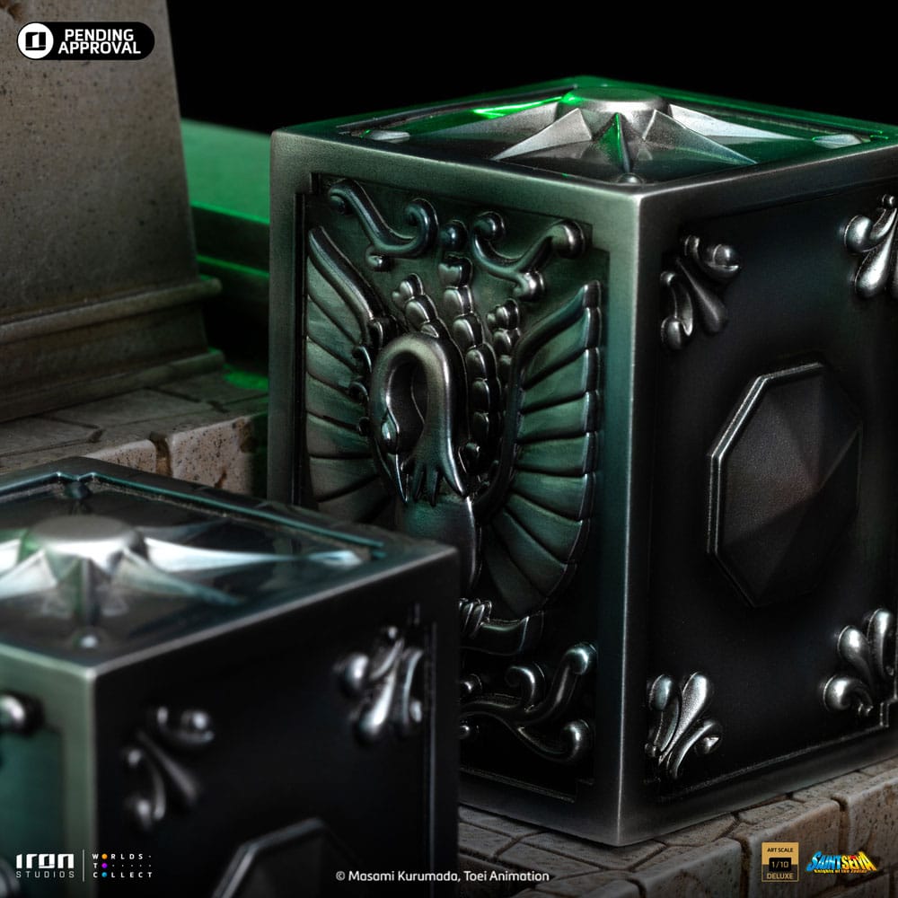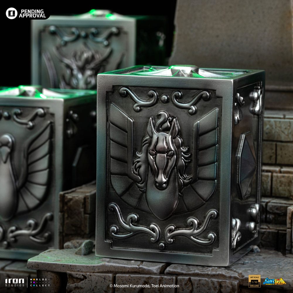 Pandora Boxes of the Bronze Saints Pegasus, Cygnus, Dragon, Andromeda, and Phoenix, containing the respective powerful Cloths, for the five hero defenders of the goddess Athena reborn to protect the world in the 20th Century. Iron Studios proudly present the exclusive statue “Saori Kiddo Deluxe – Saint Seiya – Art Scale