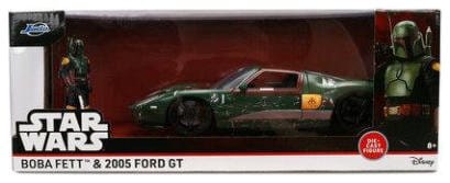 Die-cast vehicle model of the 2005 Ford GT in 1:24 scale with a Boba Fett design. The model features freewheeling, opening doors, trunk, and hood. Includes a die-cast Boba Fett figure.
