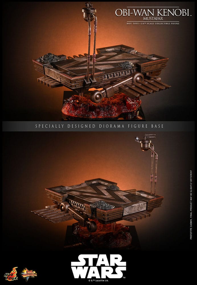 The Star Wars action figure is dressed in a finely tailored costume applied with weathering effects to capture the intensity of the fierce duel on Mustafar. His ensemble includes a tabard, outer tunic, and under tunic, all tied together at the waist with an obi and a detailed utility belt, completed by pants and long boots. Included are nine interchangeable hands and blue lightsaber blades with both LED-lighted and non-lighted hilt options for dynamic action. The figure is displayed on a specially designed diorama base featuring a repulsor platform and lava effects that replicate Mustafar’s volcanic landscape, allowing collectors to recreate the iconic duel scene between Obi-Wan Kenobi and Anakin Skywalker.