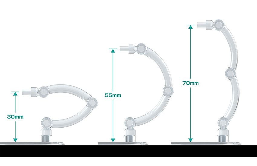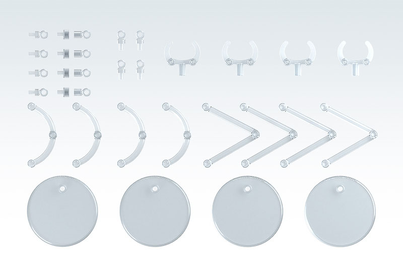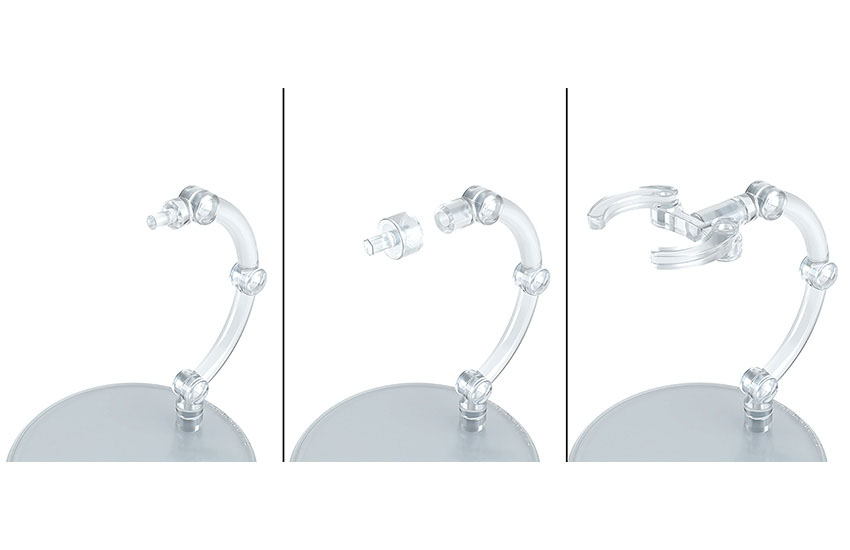 Presenting a set of 4 simple and affordable display stands! These stands, perfect for small figures around 10cm in height, feature a plain, transparent design. The support arm is equipped with a 3mm pin for connecting to holes of corresponding size. Attachable clamp-style parts and hexagonal pin parts for Nendoroid figures* are also included. The stands are made with transparent ABS resin. The diameter of each base is around 6cm. Two types of support arms-a curved type and straight type-are included. The curved support arm can be adjusted from 3 to 7cm in height, while the straight support arm can be adjusted from 4.5 to 10.7cm in height.