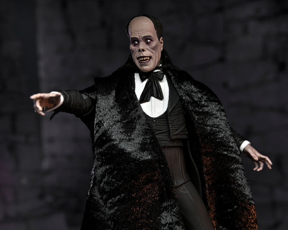 Celebrating more horror legends, NECA is excited to reveal The Phantom of the Opera! Starring Lon Chaney, the 1925 silent movie was famed for the shocking appearance of the Phantom, which Chaney created himself and kept secret until the premiere. Almost a century later, the thriller is still critically acclaimed and was added to the United States National Film Registry in 1988 for its historical and cultural significance. The 7″ scale figure captures the Phantom both disguised and unmasked with five interchangeable heads, and also includes fabric cloak, bamboo stick and hat accessories. Display-friendly window box packaging with opening front flap.